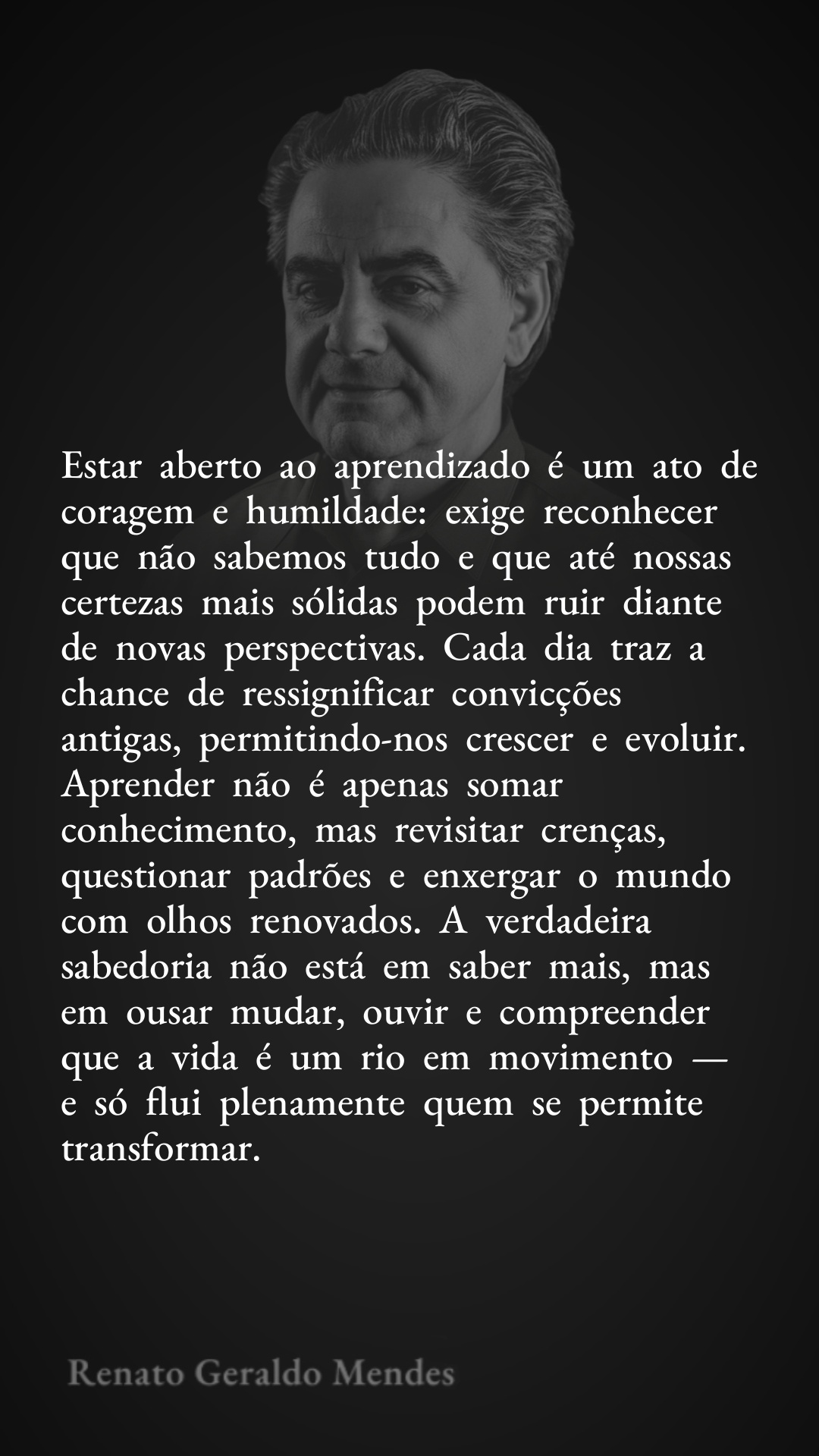 Estar aberto ao aprendizado é um ato de coragem e humildade: exige reconhecer que não sabemos tudo e que até nossas certezas mais sólidas podem ruir diante de novas perspectivas. Cada dia traz a chance de ressignificar convicções antigas, permitindo-nos crescer e evoluir. Aprender não é apenas somar conhecimento, mas revisitar crenças, questionar padrões e enxergar o mundo com olhos renovados. A verdadeira sabedoria não está em saber mais, mas em ousar mudar, ouvir e compreender que a vida é um rio em movimento — e só flui plenamente quem se permite transformar.