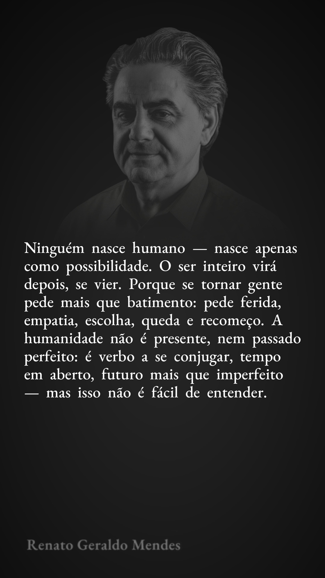 Ninguém nasce humano — nasce apenas como possibilidade. O ser inteiro virá depois, se vier. Porque se tornar gente pede mais que batimento: pede ferida, empatia, escolha, queda e recomeço. A humanidade não é presente, nem passado perfeito: é verbo a se conjugar, tempo em aberto, futuro mais que imperfeito — mas isso não é fácil de entender.