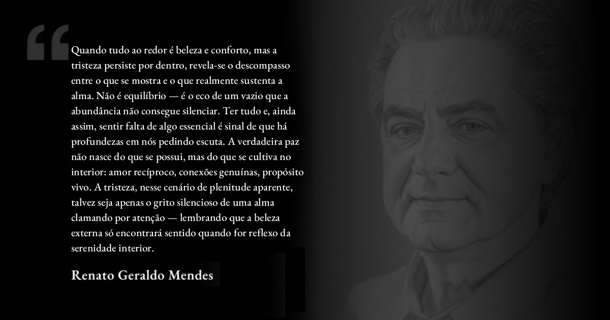 Quando tudo ao redor é beleza e conforto, mas a tristeza persiste por dentro, revela-se o descompasso entre o que se mostra e o que realmente sustenta a alma. Não é equilíbrio — é o eco de um vazio que a abundância não consegue silenciar. Ter tudo e, ainda assim, sentir falta de algo essencial é sinal de que há profundezas em nós pedindo escuta. A verdadeira paz não nasce do que se possui, mas do que se cultiva no interior: amor recíproco, conexões genuínas, propósito vivo. A tristeza, nesse cenário de plenitude aparente, talvez seja apenas o grito silencioso de uma alma clamando por atenção — lembrando que a beleza externa só encontrará sentido quando for reflexo da serenidade interior.