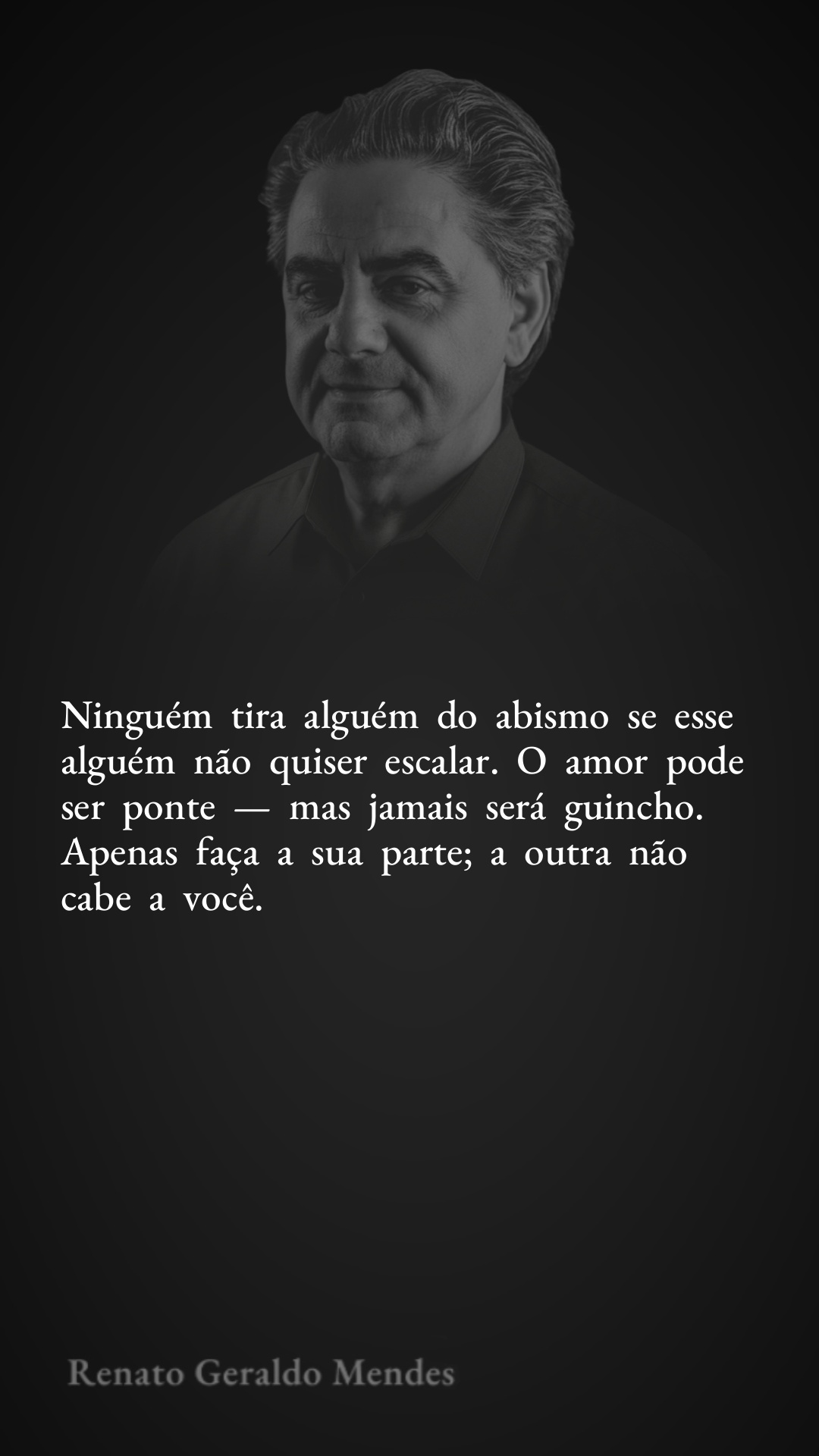 Ninguém tira alguém do abismo se esse alguém não quiser escalar. O amor pode ser ponte — mas jamais será guincho. Apenas faça a sua parte; a outra não cabe a você.